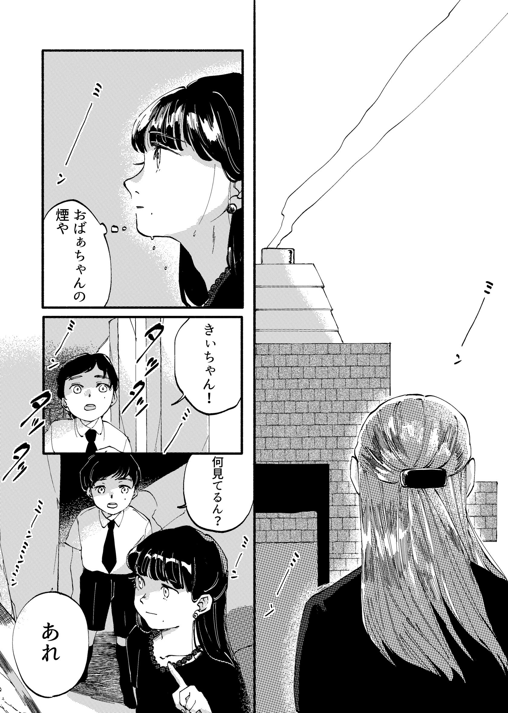 火葬場から立ちのぼる煙を見上げ、天へと昇っていく祖母の姿を実感する。